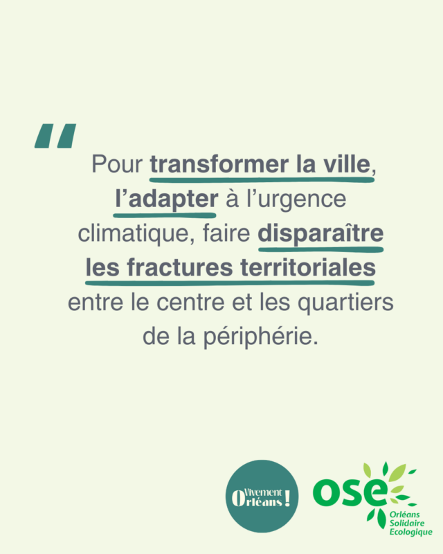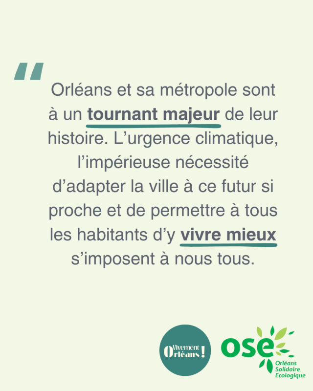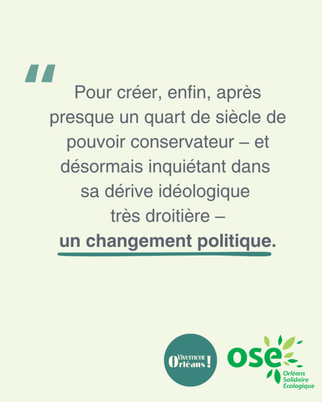 Ces ambitions réalistes et nécessaires nourrissent et enrichissent celles d’OSE pour créer, enfin, après presque un quart de siècle de pouvoir conservateur – et désormais inquiétant dans sa dérive idéologique très droitière –, un changement politique et un développement collectif des compétences dans le champ de l’écologie et de la solidarité. Transformer la ville, l’adapter à l’urgence climatique, faire disparaître les fractures territoriales entre le centre et les quartiers de la périphérie, faciliter la vie des Orléanaises et des Orléanais, moderniser sa gouvernance : tels sont nos objectifs partagés.