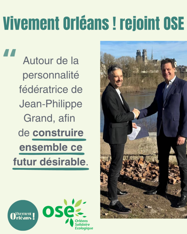 Nous considérons que l’écologie et la solidarité doivent devenir nos lignes d’horizon. Pour cela, les femmes et les hommes appartenant à Vivement Orléans !, rassemblement d’Orléanaises et d’Orléanais qui souhaitent penser leur cadre de vie, réfléchir et agir pour le futur d’Orléans et de sa métropole, ont choisi de s’unir avec le collectif citoyen OSE, autour de la personnalité fédératrice de Jean-Philippe Grand, afin de construire ensemble ce futur désirable.