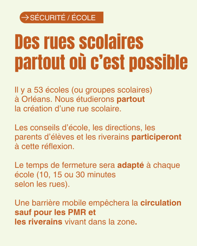 Il y a 53 écoles (ou groupes scolaires) à Orléans. Nous étudierons partout la création d’une rue scolaire. Aux abords de l’école, la circulation motorisée sera interdite au moment de l’entrée et de la sortie des élèves, le matin, le midi et le soir pendant quelques minutes.