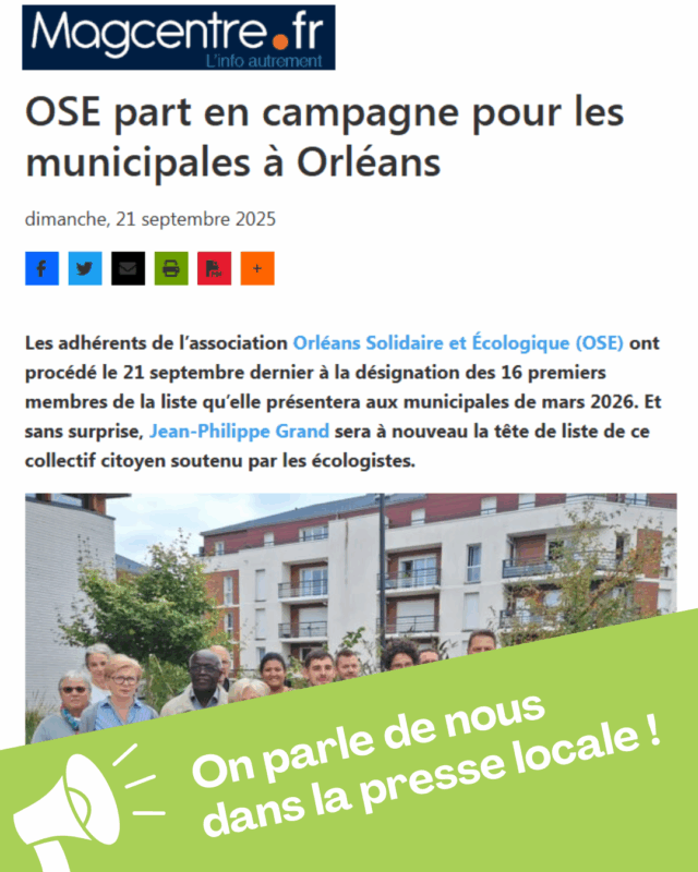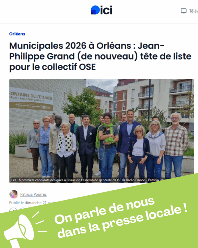 La presse locale s’est faite l’écho de la désignation des 16 premières personnes qui figureront sur la liste d’alternative citoyenne que OSE souhaite construire, et de celle de Jean-Philippe Grand comme tête de liste. Les adhérents ont expérimenté les pratiques nouvelles et les méthodes démocratiques qui nous sont chères : désignation par les pairs, élection sans candidat dans un climat de bienveillance et d’écoute. Notre démarche reste celle de l’ouverture (chacun peut adhérer à OSE).