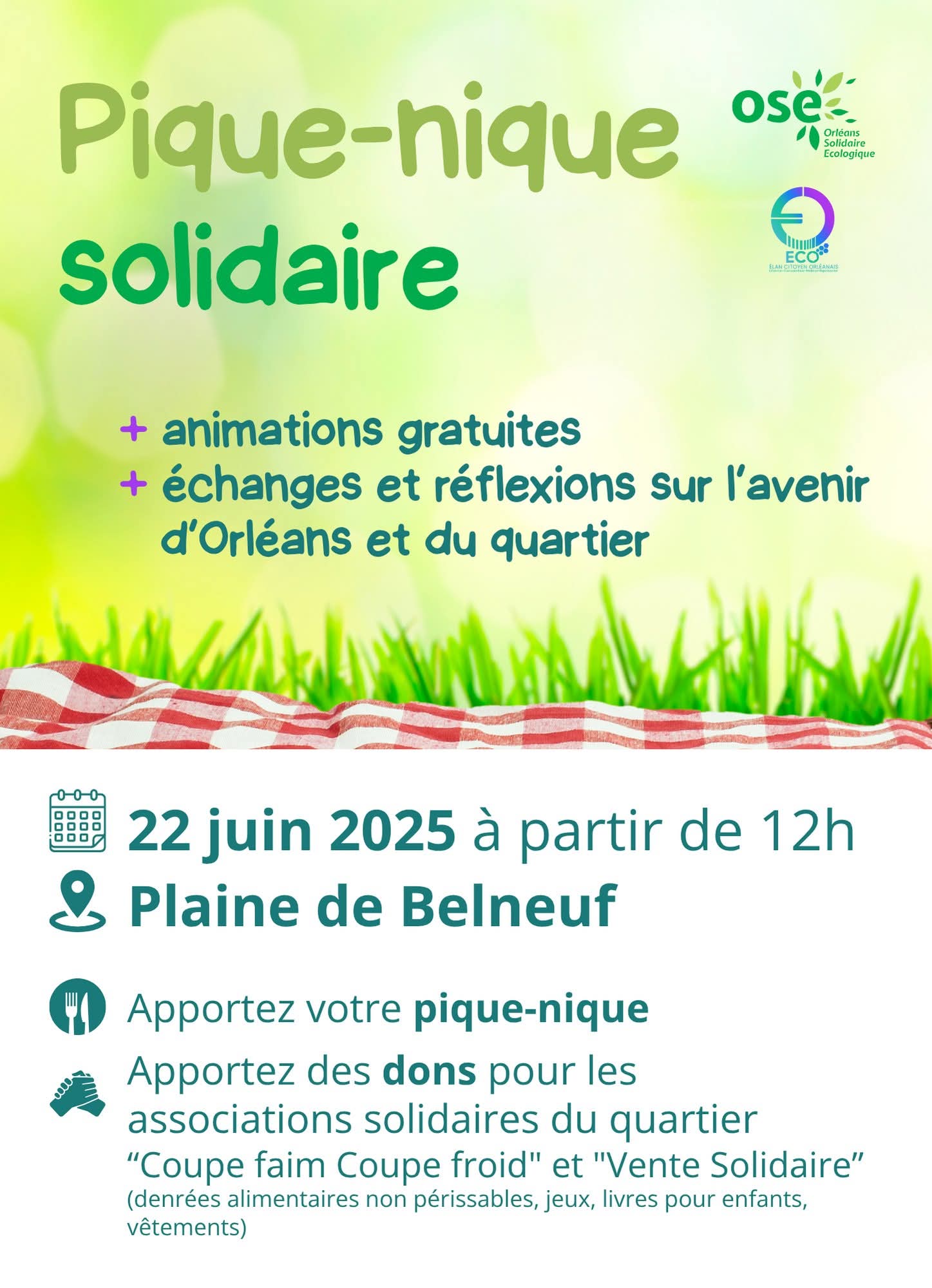Orléans Solidaire et Écologique et Elan Citoyen Solidaire vous invitent à un pique-nique solidaire le 22 juin 2025 à partir de 12h à la Plaine de jeux de Belneuf – Orléans.